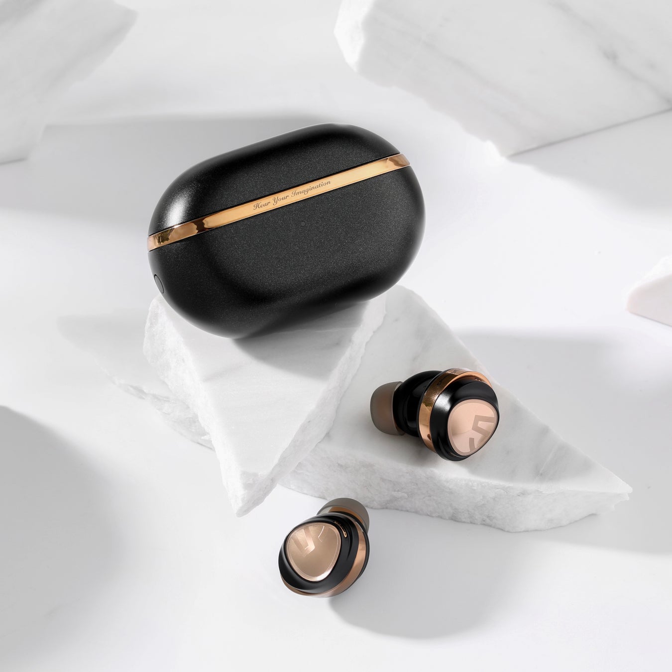 光沢感のある鏡面仕上げと艶消しのマット仕上げを組み合わせることによって、ジュエリーのような魅力を解き放つ、目や指先でも楽しめるイヤホンに仕上げました。ブラックの本体カラーに、イエローゴールドのアクセントが特徴で、傷がつきにくい亜鉛合金を含む5つの素材を使用し、PVDコーティングや真空メッキなどの11の塗装を施しています。