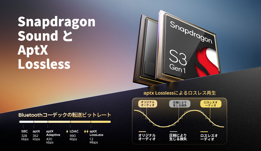 オーディオコーデックには最大96kHz/24bitというハイレゾ品質の再生能力を備える「aptX Adaptive」、CD品質44.1kHz/16bitのロスレス再生を実現する「aptX Lossless」をサポートするほか、音質指向のワイヤレスオーディオに多数の採用実績を誇る「LDAC」、次世代Bluetoothオーディオ規格に採用された低遅延/高効率の「LC3」もサポートします。まさに、高音質コーデックが”全部入り”です。