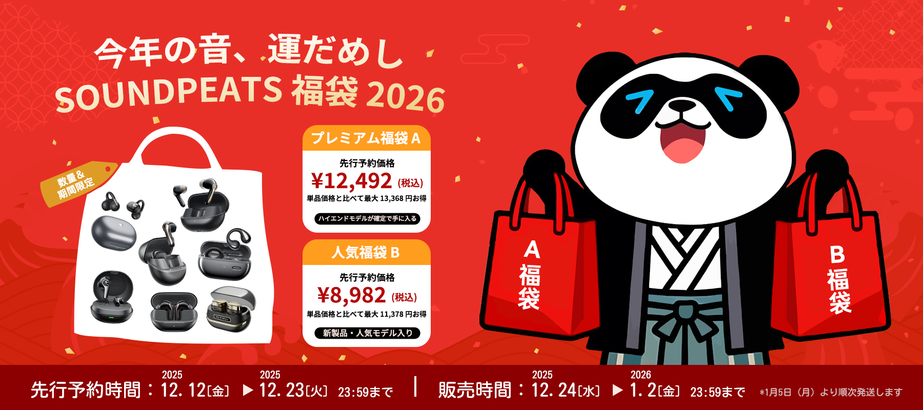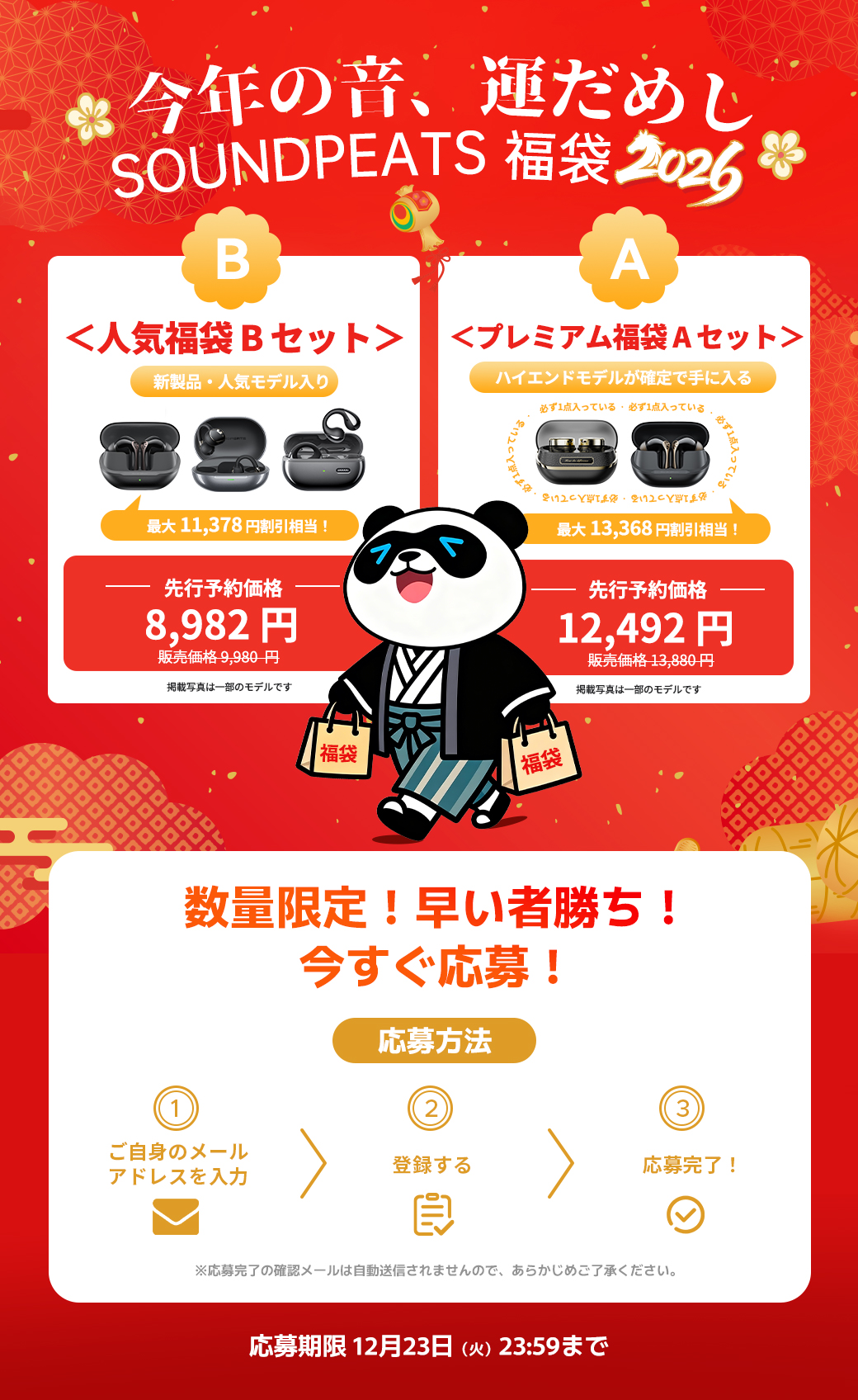 3.本ページよりメールアドレスをご登録いただいた方全員にAmazonクーポンコードをプレゼント。有効期限内にクーポンコードを利用すればSOUNDPEATS福袋 2026は販売価格より10%OFFでご購入いただけます。