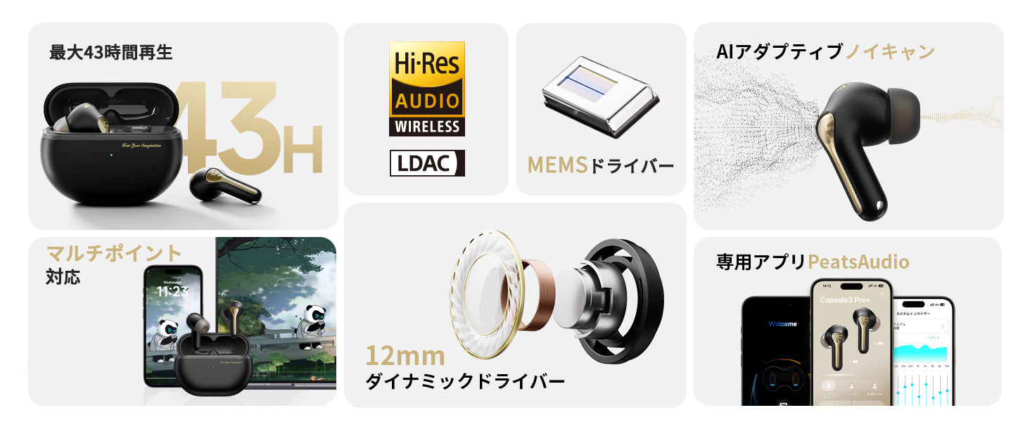 SOUNDPEATS Capsule3 Pro+は、MEMSドライバーと12mmダイナミックドライバーを組み合わせたハイブリッド構成を採用しています。xMEMS製「Cowell」MEMSドライバーが高音域を駆動、シリコン振動板の硬さと軽さを活かして高域の再生周波数帯域を広げ、音の歪みを抑えます。低音域には12mm径バイオセルロース製ダイナミックドライバーを使用、振幅の大きさを生かした躍動感と迫力があるサウンドを実現します。Capsule3 Pro+の洗練されたオーディオ体験をお楽しみください!